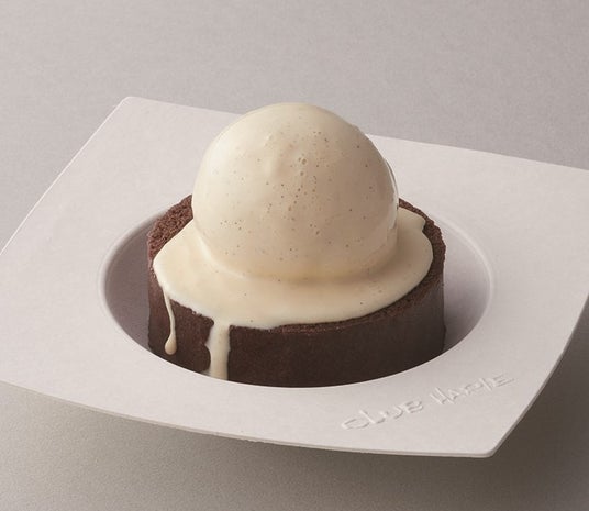 ひんやりとほかほかのかけ合わせ。温めることでチョコレートバームクーヘンの香りが引き立ち、ふんわり食感に。とろけたバニラアイスとの相性抜群です。