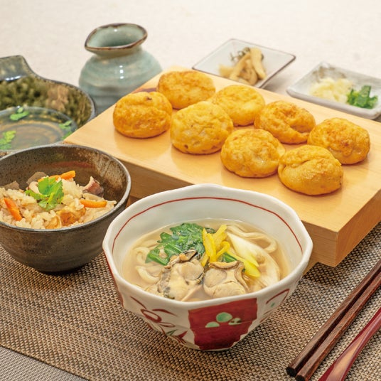 玉子焼とゆず香る牡蠣うどん 季節の炊き込みご飯セット