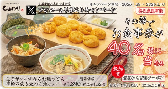 この度、玉子焼・お出汁ひまわり公式Xアカウントをフォロー&リポストして応募すると、抽選で40名様に「玉子焼とゆず香る牡蠣うどん 季節の炊き込みご飯セット1人前(税込み1,529円)」をお召し上がりいただけるデジタルお食事券プレゼントキャンペーンを2026年1月28日(水)より開催します。この機会にぜひご応募ください。