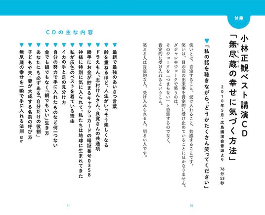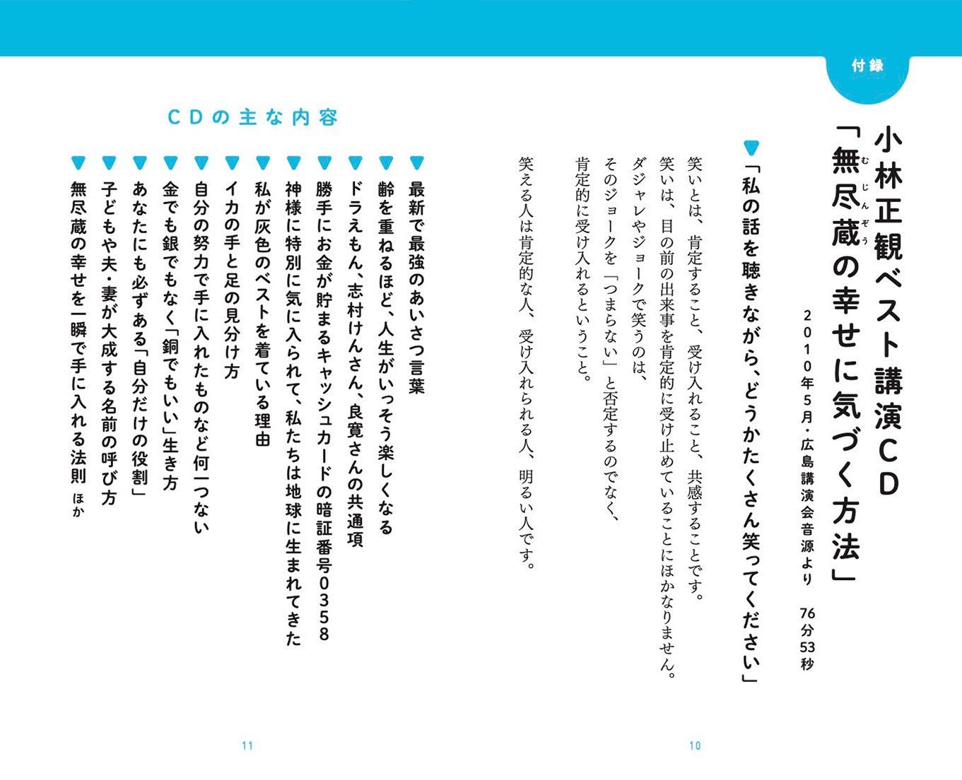 本書には、小林正観氏の代表的な講演「無尽蔵の幸せを手にする法則」を収録したCD(76分53秒)が付属。「ありがとう」に込められた力や、人生を好転させる考え方を、ご本人のやさしい語り口でじっくり聴くことができます。