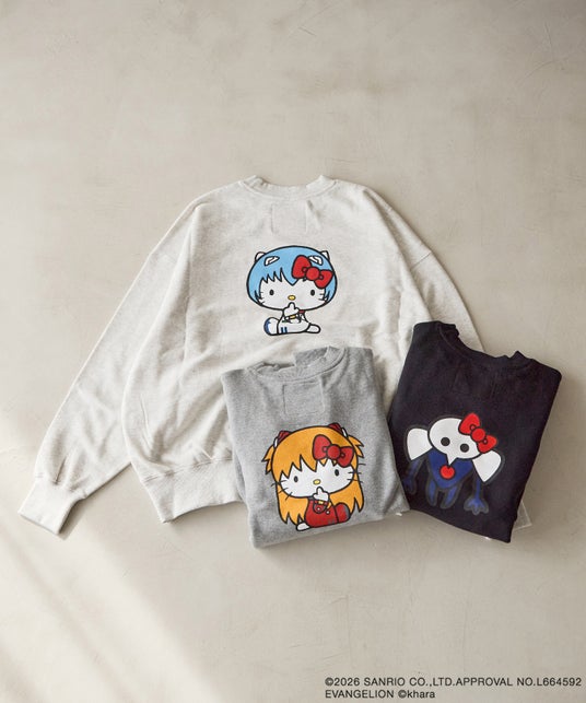 胸元にあしらった刺繍がポイントのスウェット。ポイントの刺繍は、『エヴァンゲリオン』の世界観を象徴するネルフのロゴマークと、ハローキティのトレードマークであるキュートなリボンを融合させた完全オリジナルデザインです。バックには人気キャラクターの“レイ”、“アスカ”、“第4 使徒”がハローキティとコラボレーションした特別感溢れるアートプリントを施しています。