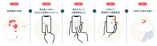 キビヤックの対応医療機関での受診後、処方せんがキビヤックファーマシーへ連携され、LINEで受領通知が送信されます。患者さまは通知に沿って操作を行うだけで、ご自宅でお薬の受け取りが可能です。