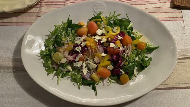 ステーキを囲むカラフルサラダ(マーシュ、フリゼレタス、ミニトマト、アーリーレッド、トレビス、ダナブルー)と