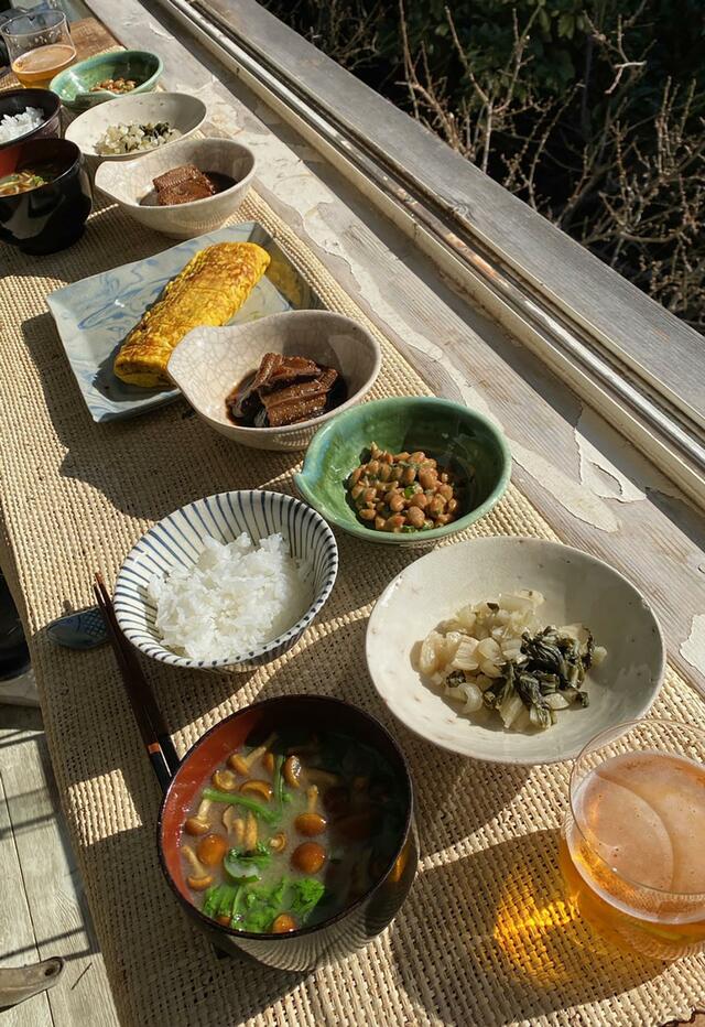 煮アナゴ、だし巻き卵、納豆、ごはん、雪白菜(しゃくしな)、なめこと春菊の味噌汁、Beer、