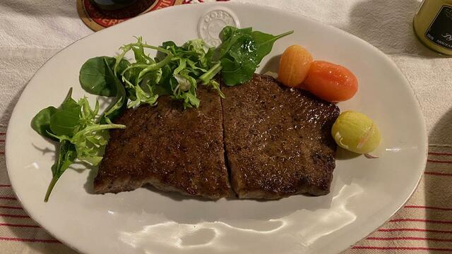 先日(火曜日)の買い物day。「すかなごっそ」で手に入れた50%offの牛肉(ザブトン)をステーキに。うまい、うまい。