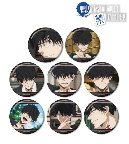 鴨乃橋ロン、一色都々丸、雨宮、シュピッツ・ファイア、翡翠臣疾、卯咲もふ、マイロ・モリアーティ、ウィンター・モリアーティの印象的なシーンを缶バッジに仕上げました。
