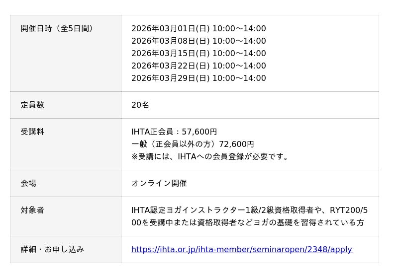 一般社団法人 国際ホリスティックセラピー協会※(事務局:東京都千代田区、代表理事長:太田 敦士、以下 IHTA)は、2026年3月1日(日)より5日間、オンラインにて『シニアヨガ[ベーシック]インストラクター養成講座』を開催いたします。