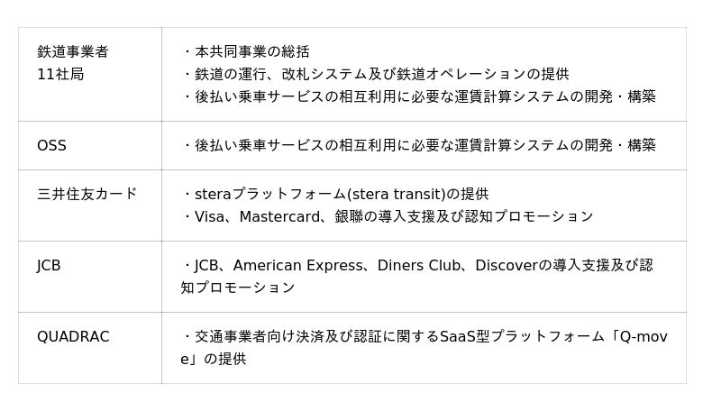 この新たな運賃計算システムと、三井住友カードが提供する公共交通機関向けソリューション「stera transit」及びQUADRACが提供するSaaS型プラットフォーム“Q-move”が連携することにより、関東での後払い乗車サービスの相互利用を実現いたします。