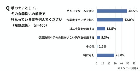 冬場の水仕事が増える季節、手のカサつきやひび割れに悩む人は少なくありません。そこでパナソニック株式会社は、日常的に食器を手洗いしている20~60代の男女400人を対象に、「冬の食器洗いと手の乾燥」に関する調査を実施しました。