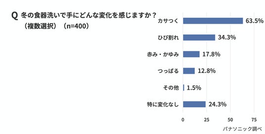 冬の食器洗いの影響として、手にどのような変化を感じているかを聞いたところ、「手がカサつく」が63.5%と最も多く、「ひび割れができる」が34.3%、「赤み・かゆみが出る」が17.8%という結果に。