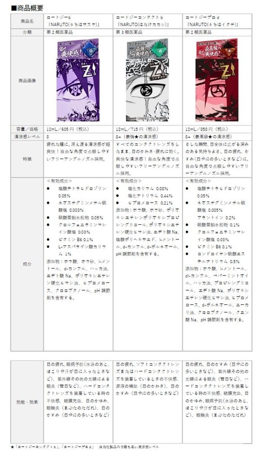 ロート製薬株式会社(本社:大阪市、社長:瀬木英俊)は、幅広い世代・国で支持される大人気 TVアニメ『NARUTO-ナルト- 疾風伝』とコラボレーションした爽快系目薬「ロートジーb NARUTO(うちはサスケ)」「ロートジー コンタクトb NARUTO(はたけカカシ)」「ロートジープロd NARUTO(うちはイタチ)」を数量限定で発売します。本品は1月29日(木)より順次、全国のドラッグストア、ECサイト等にて発売します。