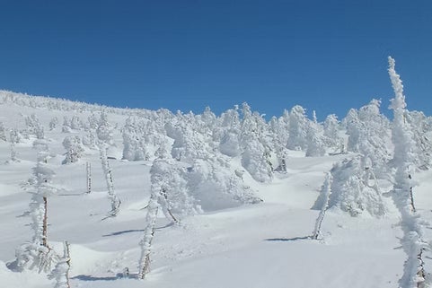 標高の高さと独特な気候が生み出す吾妻山特有のハブラシ樹氷の観賞。まるで山の住人のように連なる樹氷と白銀の世界、そして標高1,820m北望台から望む米沢盆地と大パノラマを楽しめます。