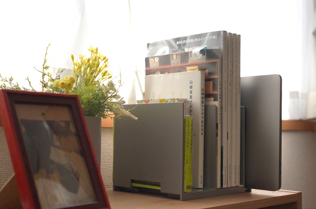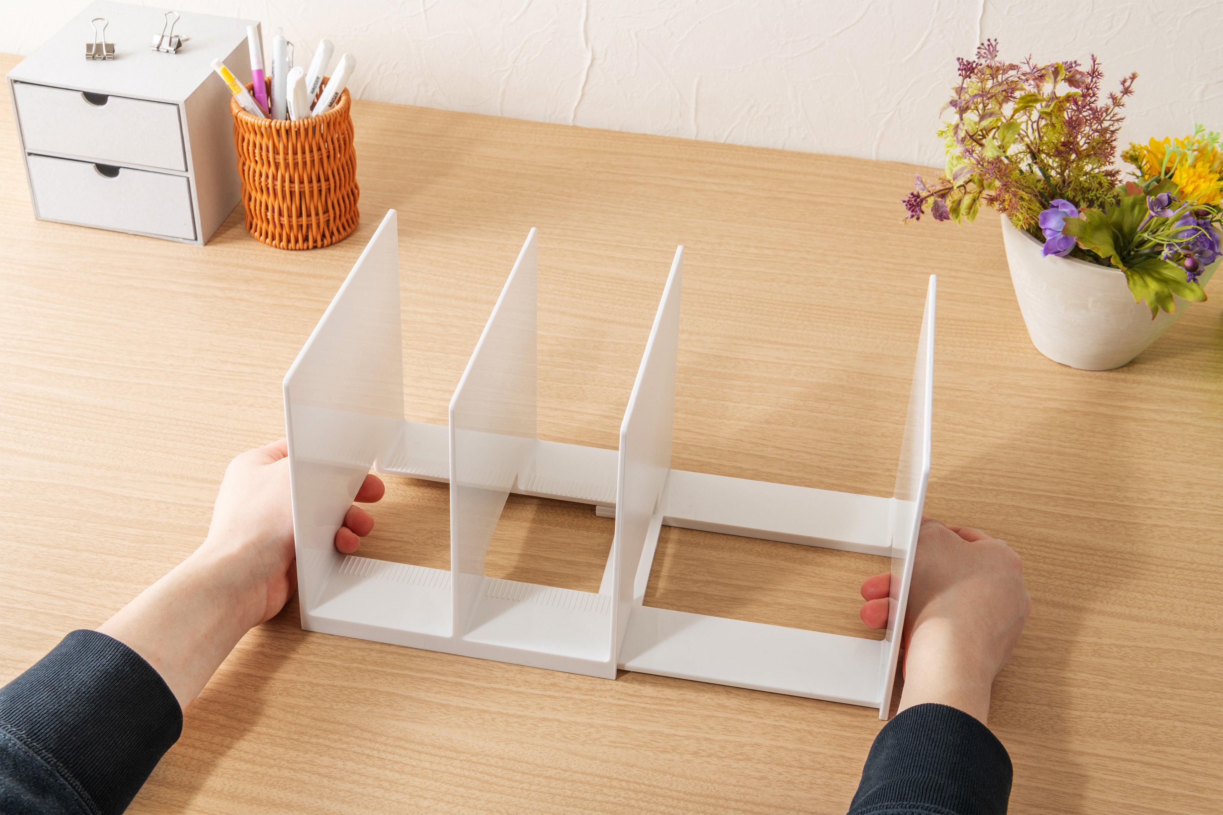- 仕切り幅が拡がるスライド式- 収納部に滑り止めがあり、少ない冊数でも安定して立てやすい