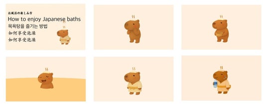 お風呂マナーを再確認したいユーザーや外国人に向けた、日本のお風呂文化を楽しく優しく紹介する動画。オリジナルキャラクター、カピバラの「あたたまる」を活用したショートムービーです。賛助団体の「お風呂関連施設」(温浴施設、銭湯、サウナ、温泉、宿泊施設等)で展開。