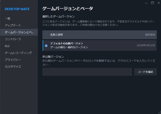 1. Steamクライアント上から「Desktop Mate > プロパティ > ゲームバージョンとベータ」と進む