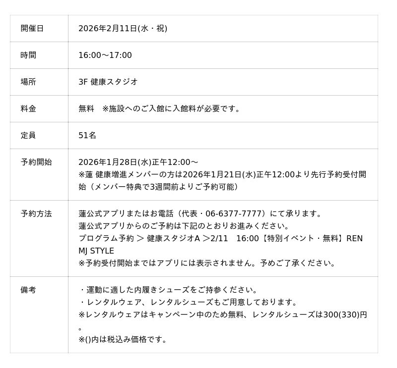 「うめきた温泉 蓮 Wellbeing Park」(総支配人:藤立 達哉、所在地:大阪市)では、2026年2月11日にダンスインストラクター「U-key」による特別レッスンイベント「REN MJ STYLE - DANCE & MOTION -」 を開催することをお知らせします。