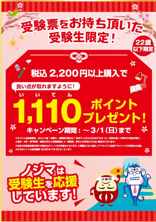 株式会社ノジマ(神奈川県横浜市、代表執行役社長・野島廣司)では、受験生を対象に「1,110(良い点)」ポイントをプレゼントするキャンペーンを実施中です。当初スマホもしくはスマホ関連商品をご購入の受験生を対象にキャンペーンを開始しましたが、より多くの受験生を応援するべく、1月24日(土)より対象を大幅に拡大し、スマホ以外の商品でも税込み2,200円以上のご購入でポイントをプレゼントします。また、キャンペーン期間を3月1日(日)まで延長いたします。現在新生活応援フェアも開催中のため、新入学や新生活準備についてノジマにお気軽にご相談ください。