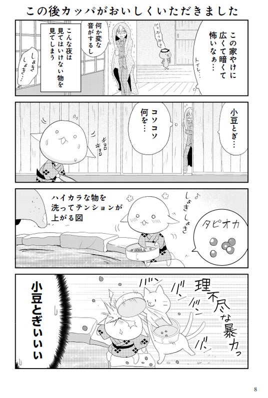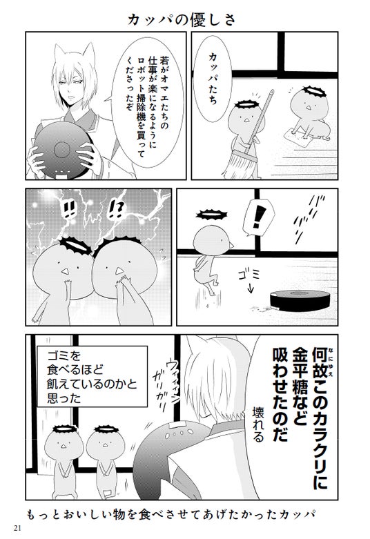 43匹の心優しいカッパ、自分をナメてるものには容赦がない猫又の白玉、そんな白玉にシバかれる不憫な小豆とぎなど。