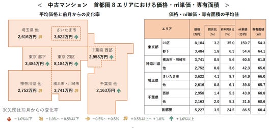 なお、東京都(23区/都下)、神奈川県(横浜市・川崎市/他)、さいたま市の5エリアは2017年1月以降最高額を更新。東京23区の連続更新は17カ月となり、平均価格は初めて8,000万円を超えた。
