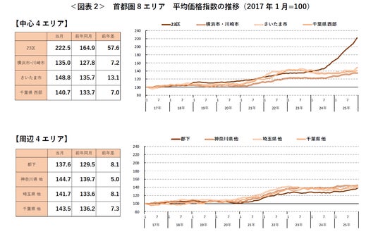 エリア別では、東京都(23区/都下)、さいたま市、千葉県(西部/他)で前月比+1%を超える上昇となるなど全8エリアで上昇。前年同月比でも8カ月連続で全エリアが上昇した。