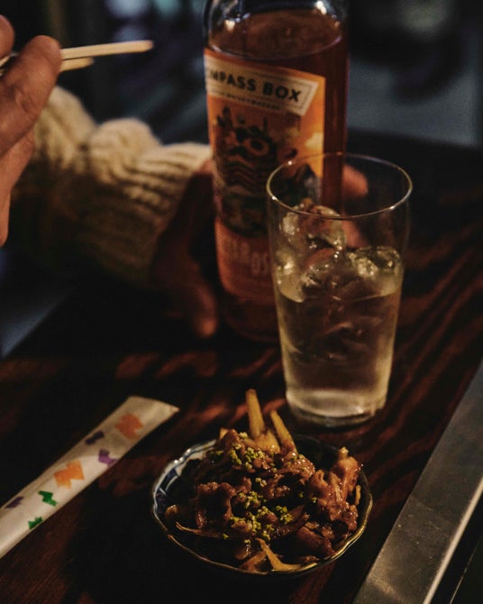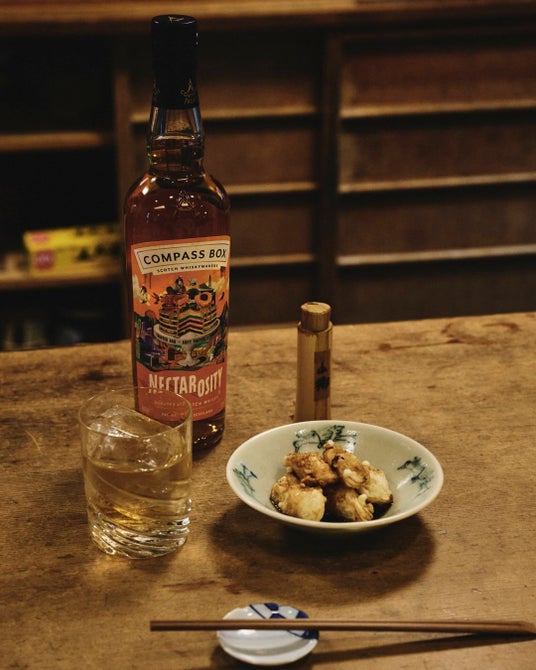 そば鶴京都・一乗寺で1973年に創業。三兄妹が受け継ぐ蕎麦屋で、酒と蕎麦前の時間が静かに積み重ねられてきた。本企画では、コンパス ボックスの〈ネクタロシティ〉をオン・ザ・ロックで提案。合わせるのは、名物の「葱の天ぷら」。出汁と葱の甘みを受け止め、途中で山椒を加えることで香りが引き締まる。一杯で完結するのではなく、食事の流れに寄り添いながら役割を変えていく酒が、蕎麦前という時間を心地よく支えている。