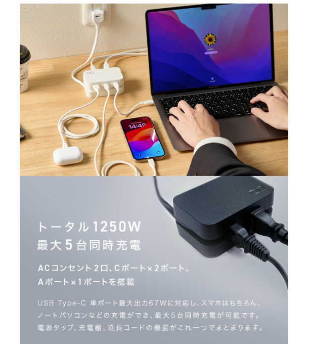 AC100V電源タップ2口、USB-Cを2ポート、USB-Aを1ポート搭載し、1つのコンセントからスマートフォン・タブレット・PCなど5台の機器に同時充電できます。