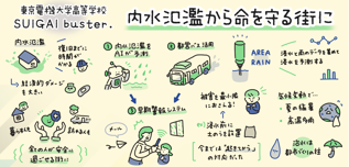 雨天時、下水道や水路が排水能力を超え、道路や建物内に雨水があふれる内水氾濫の被害低減を目指し、浸水検知器とリアルタイムの降雨状況を組み合わせて、AIが浸水の発生確率を算出する仕組みを提案。