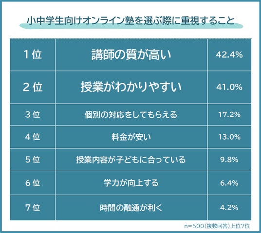 「小中学生向けオンライン塾を選ぶ際に重視すること」を聞いたところ、1位は「講師の質が高い(42.4%)」、僅差の2位は「授業がわかりやすい(41.0%)」でした。3位「個別の対応をしてもらえる(17.2%)」、4位「料金が安い(13.0%)」、5位「授業内容が子どもに合っている(9.8%)」が続きます。