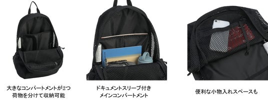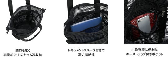 メッシュは外側から中身が見えるので、どこに何を入れているかを一目で確認できる実用性と、彩度の高い小物などを入れてメッシュの隙間から見せることができるファッション性を兼ね備えており、おしゃれで実用的なアイテムとしても活躍します。ドキュメントスリーブ、サイドポケットに加えて2つのフロントポケットも付いているので、日常使いのバッグとしても大変便利です。