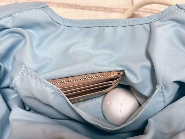 シャカシャカとした軽やかなナイロン素材で、しっかり裏地付き。A4サイズも余裕で入り、肩がけできるのも◎。