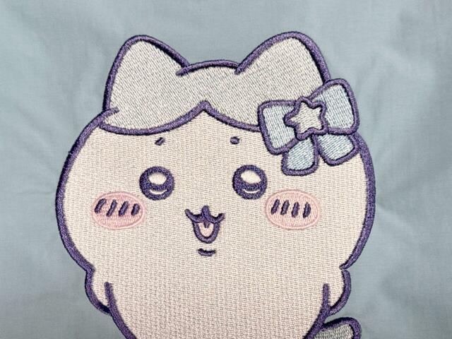 フロントには、片耳にリボンをつけたハチワレが刺繍で描かれています。後ろで手を組み、足をクロスさせたポーズがたまらなくかわいい〜!刺繍のクオリティも非常に高くて大満足です◎