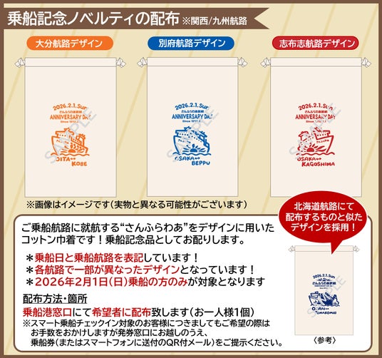 株式会社商船三井さんふらわあ(代表取締役:牛奥 博俊)は、長年にわたる「さんふらわあ」へのご愛顧に感謝の意を込め、2026年2月1日(日)に大阪/別府航路、大分/神戸航路、大阪/志布志航路において、「さんふらわあ就航アニバーサリーデー2026」を実施いたします。