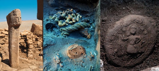 (左)カラハンテぺにて出土した人の顔が彫られたT字形の柱、(中央)クズラン・オスマン帝国難破船の遺物、(右)カラマンにて発見された約1300年前のパン