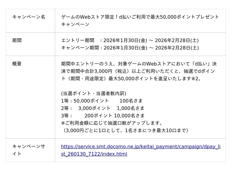 株式会社NTTドコモ(以下、ドコモ)は、対象ゲーム※1のWebストアにおいて「d払い(R)」決済をご利用いただくと、抽選でdポイント(期間・用途限定)最大50,000ポイントを進呈する「ゲームのWebストア限定!d払いご利用で最大50,000ポイントプレゼントキャンペーン(以下、本キャンペーン)」を2026年1月30日(金)から2026年2月28日(土)までの期間で開催いたします。