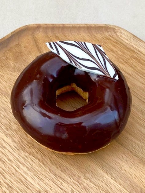 もちもち生地の揚げドーナッツにチョコレートグラサージュを合わせた、シンプルな仕上がり。マーブルチョコがさりげないアクセントになっています。