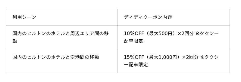 国内のヒルトンのホテルを乗車地点または目的地として利用するお客様を対象に、ホテル周辺での移動や空港との送迎に使えるディディ限定割引クーポンを提供します。