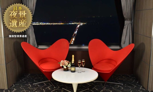 「日本夜景遺産」にも選定された煌めく夜景を背景に、可愛らしいハート型のソファを設えたフォトスポット
