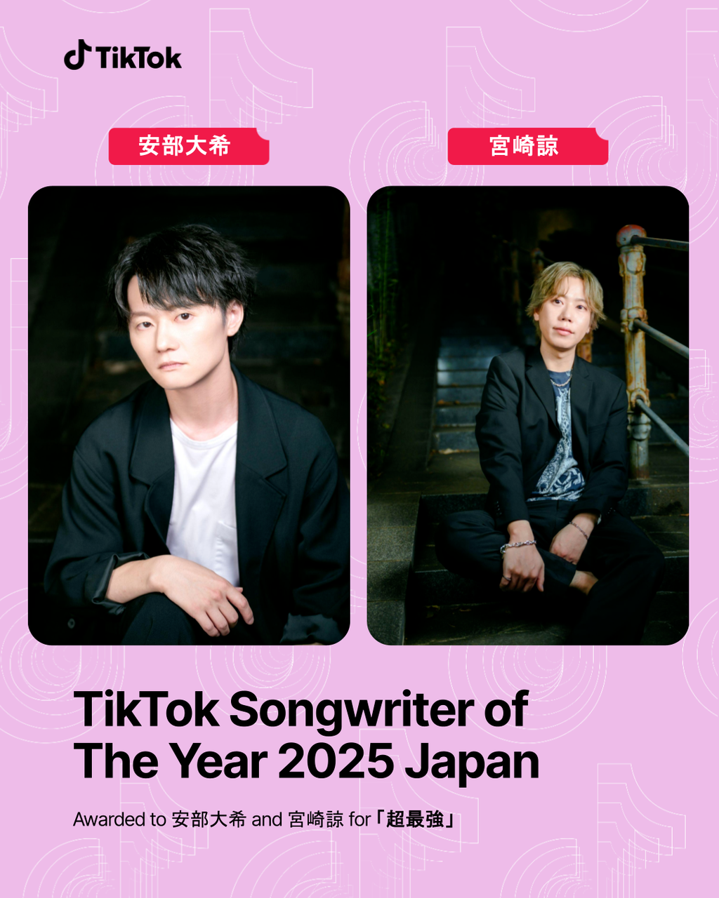 「超最強」は、「TikTokトレンド大賞2025」にてインパクト・ソング部門賞を受賞し、「TikTok Year in Music 2025」および「Songs of The Summer 2025」にも選出されるなど、2025年にTikTok上で最も大きな盛り上がりを見せた楽曲のひとつです。特にBメロの“スマホのカメラロール”のフレーズを使った音源が数多く使用され、振り付けを楽しむユーザーや他アーティストによる投稿が次々と生まれました。こうした2025年のTikTokを代表する楽曲を手がけたソングライター、安部大希、宮崎諒の受賞を、改めてお祝いします。