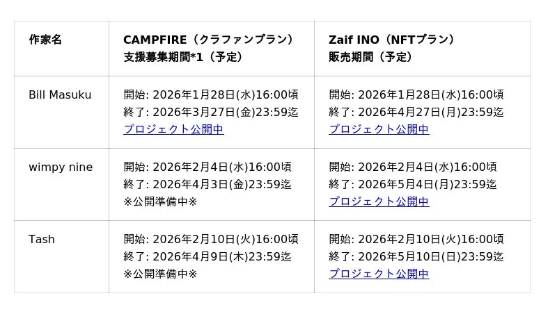 本プロジェクトでは、クラウドファンディングサイトCAMPFIREとNFT販売を行うZaif INO特設サイトで支援者の募集スケジュールが異なります。