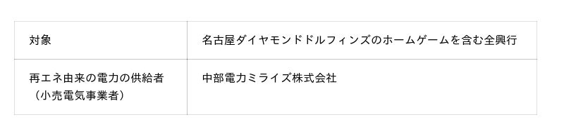 名古屋ダイヤモンドドルフィンズが、2025-26シーズンよりホームゲーム会場として使用している「IGアリーナ」は、中部電力ミライズ株式会社が提供するCO2フリー電気「Greenでんき」を100%導入することにより、ホームゲームを含む全ての興行において、再生可能エネルギー電力を使用しています。
