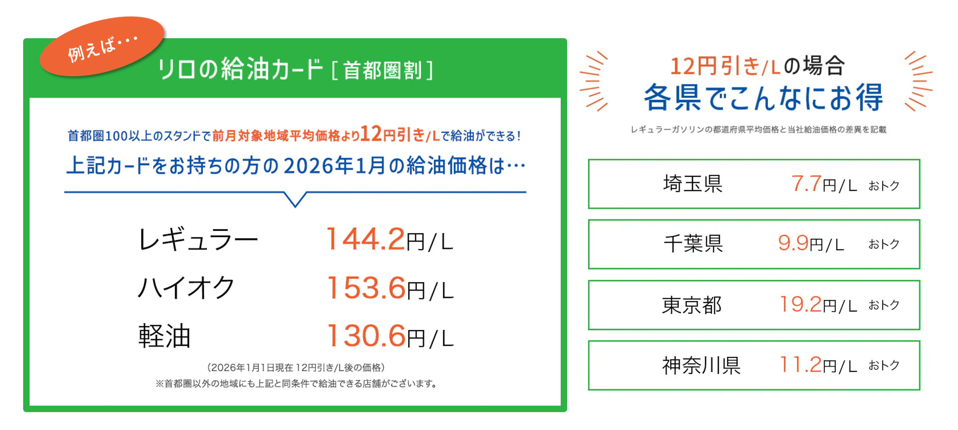 こうした背景を踏まえ、リロクラブでは2026年1月から「リロの給油カード」に、北海道地域平均価格から1リットルあたり15円引きで給油いただける『北海道割』をスタートさせました。あわせて、2025年12月から提供を開始した北海道限定「リロの宅配灯油(一般市況価格*3 から7円/L引き)」とともに、北海道にお住いの会員の皆さまの日常生活を継続的に支援してまいります。