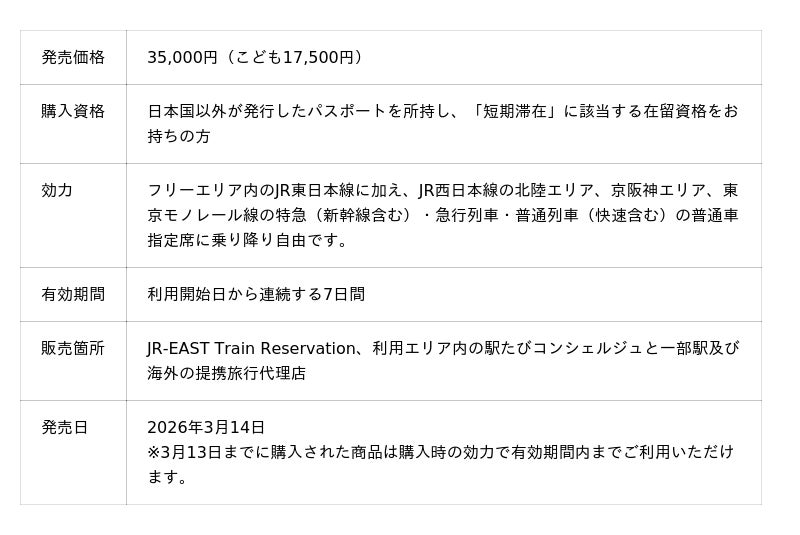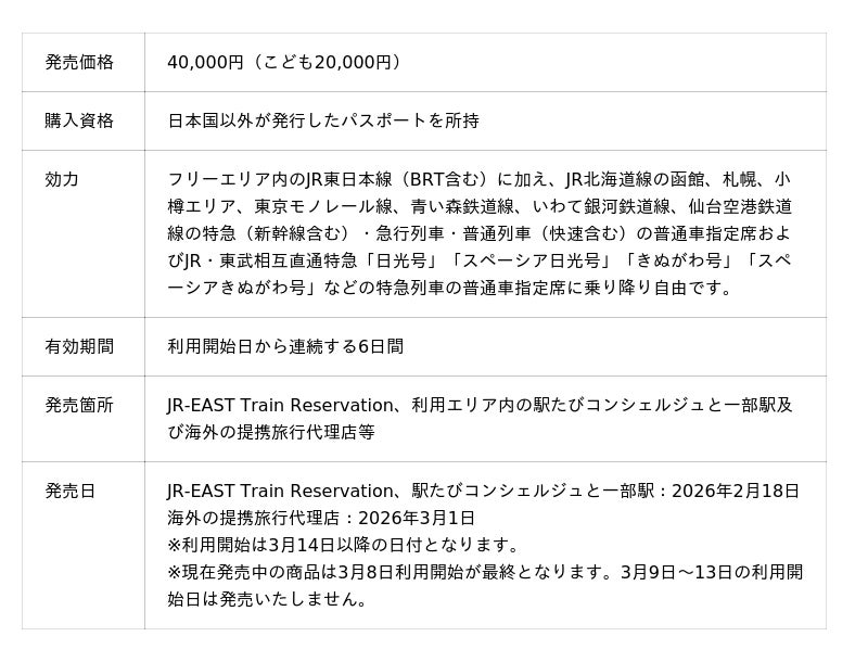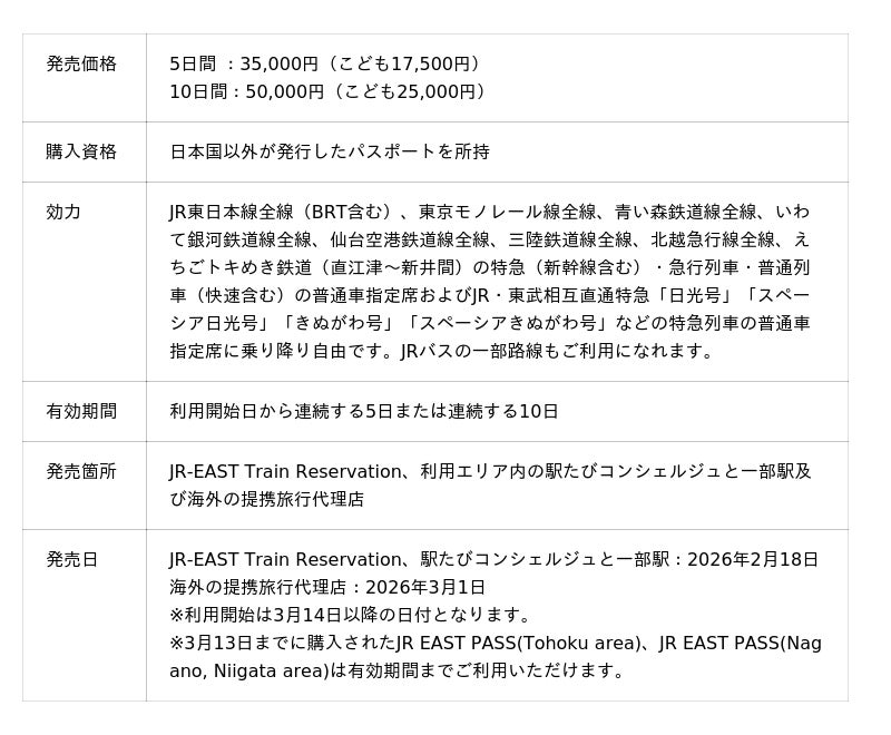 ※「JR EAST PASS(Tohoku area)」「JR EAST PASS(Nagano, Niigata area)」は2026年3月13日(金)を持ちまして販売終了となります。