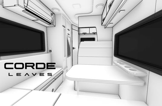 第3世代のコルドリーブスのベースはISUZU Travio。普通免許で運転可能で5m × 2mに収まるボディサイズで、6人乗車6人就寝を実現。安定した走行を実現するための空力造形。埋込式のサイドオーニングや低重心サブフレームにより走行安定性が向上。