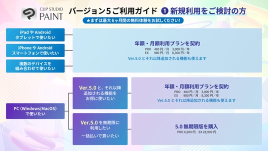 CLIP STUDIO PAINTの現在のご利用状況に応じて、Ver.5.0をご利用いただける方法は異なります。▼CLIP STUDIO PAINTを新規でご検討の方