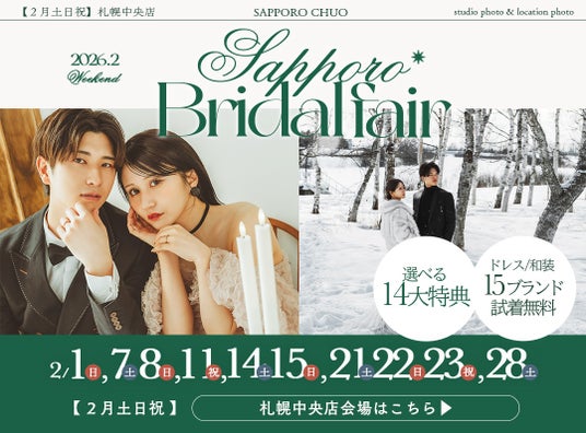 有限会社三景スタジオ(本社:北海道旭川市、代表取締役:大西康弘)が運営する「写真工房ぱれっと」は、2026年2月の週末限定で、これから結婚写真を検討する20代の花嫁様に向けた「札幌ブライダルフェア」を開催いたします。 「JILL STUART」や「ISAMU MORITA」 といった憧れのブランドドレスの試着会に加え、ロケーション撮影プランが最大20%OFFになるフェア限定特典をご用意。「写真」という枠を超え、撮影そのものを「一生の思い出」にする新しいウェディングの形をお届けします。