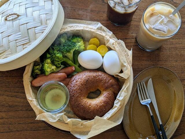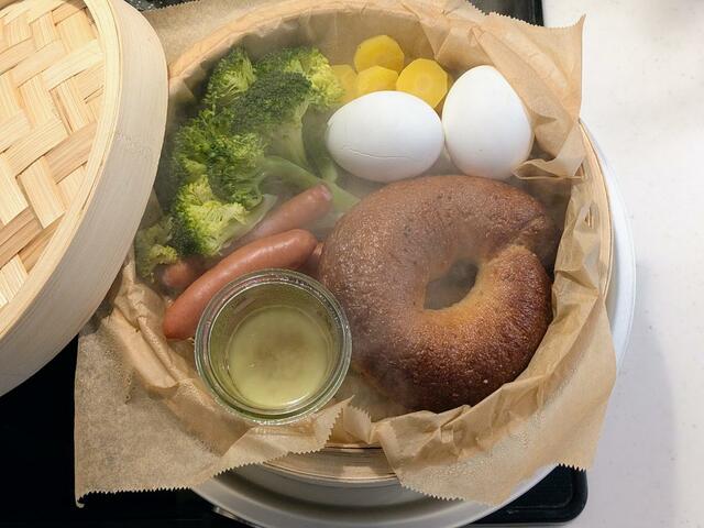 ベーグル、卵、ブロッコリーなどの野菜を一緒にせいろへ。
