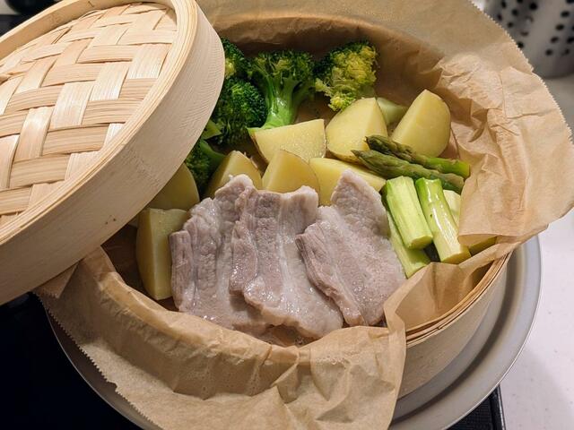 蒸し時間は10〜12分程度。豚肉にしっかり火が通り、野菜もホクホクに仕上がります。