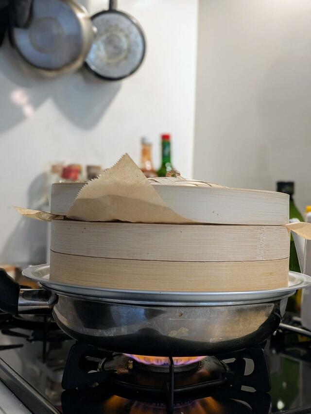 2. 鍋に湯を沸かしてせいろをのせ、蓋をして強火で7分ほど蒸す。