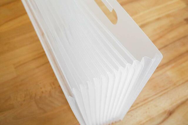 12ポケットあるので、1ポケットを1ヶ月として領収書を入れていくだけとシンプル。順番に入れていけば、ざっくり日付ごとに整理できます。