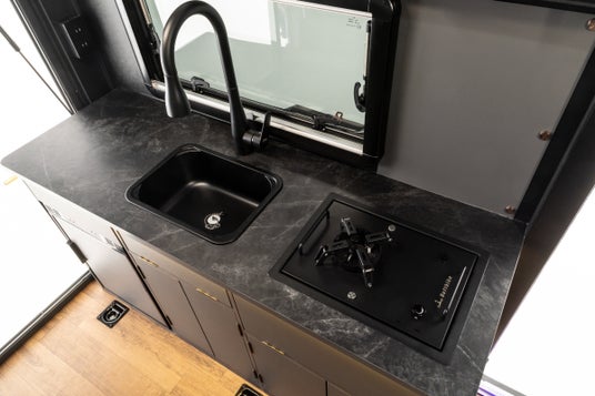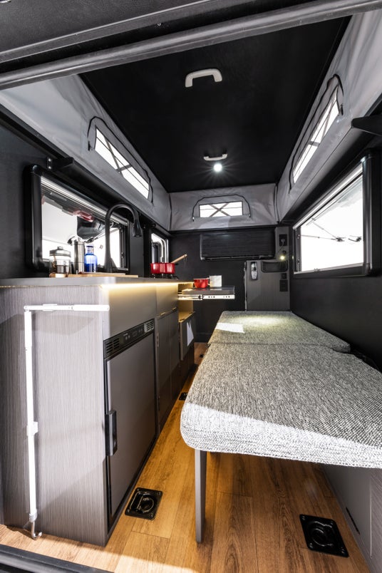 コンパクトな車内空間ながら家庭用エアコンやシンクなど、落ち着いてくつろげる空間を実現。引き出し式テーブルで食事を楽しんだり、夜はポップアップルーフのベッドと折り畳みベッドを展開してゆっくり眠ることもできます。